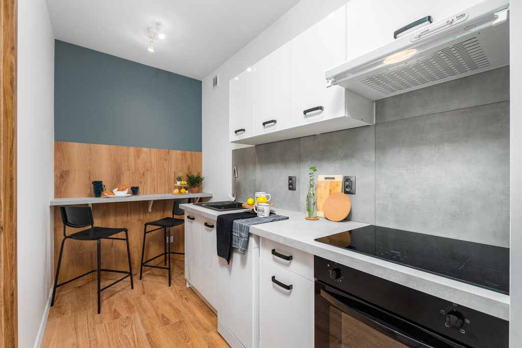Mieszkanie wyposażone jest w zmywarkę, dużą lodówkę, piekarnik, mikrofalówkę, pralkę i płytę indukcyjną.