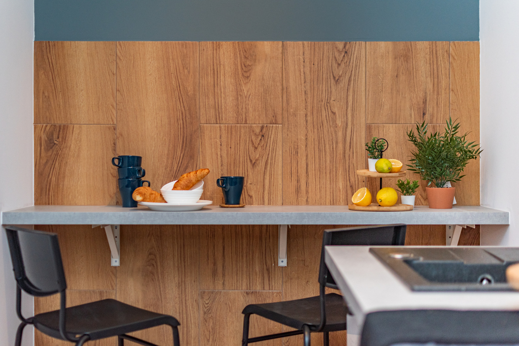 The apartment is equipped with a dishwasher, a large refrigerator, an oven, a microwave, a washing machine, and an induction hob.