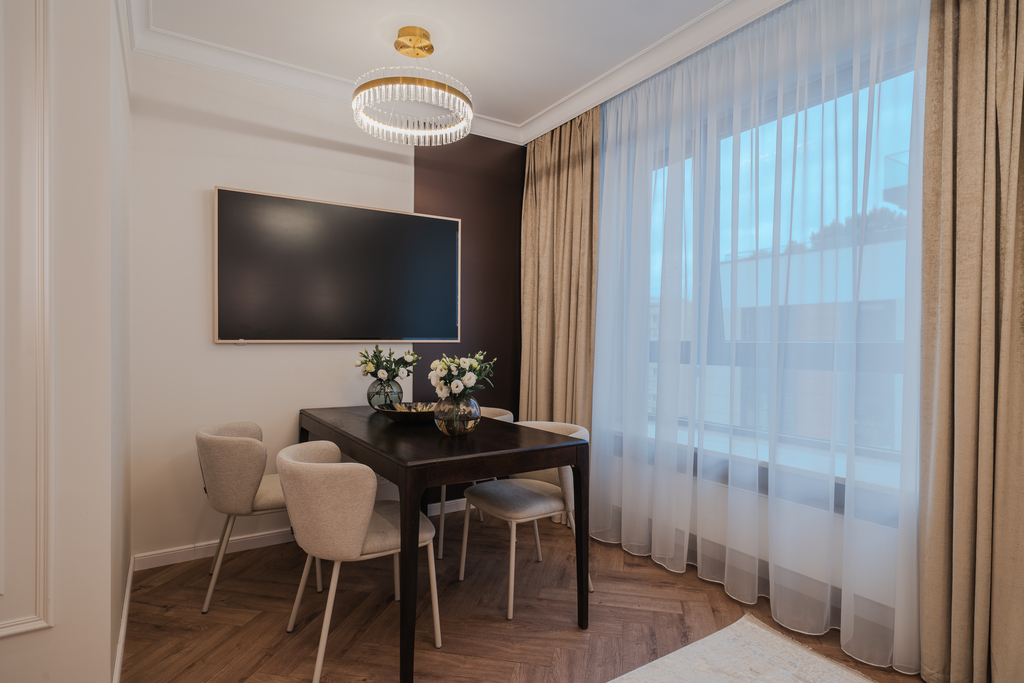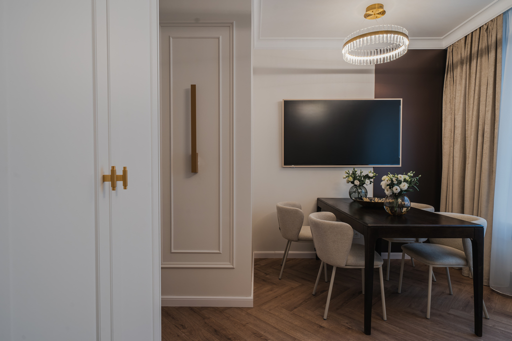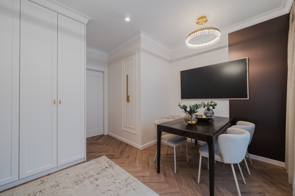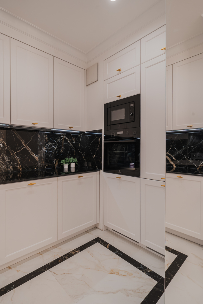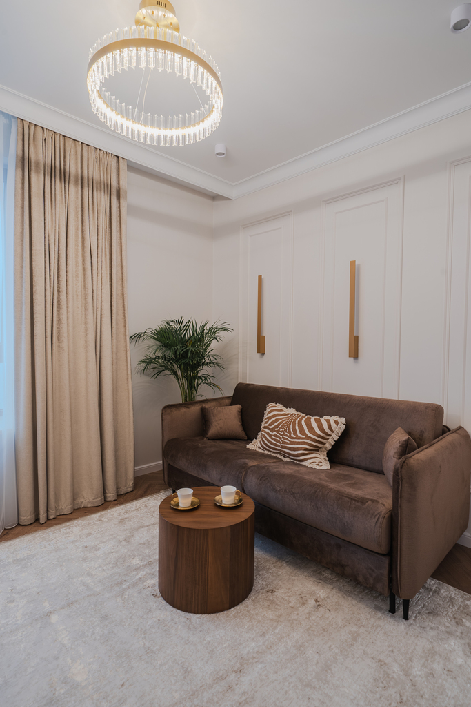 Ready to move in immediately, after a comprehensive renovation. Numerous built-in fixtures and full equipment allow you to move in without additional costs. The living room has a pull-out sofa with a full-size mattress, which increases the functionality of the space, allowing guests or household members to sleep comfortably. The kitchen is equipped with natural marble countertops, which give the interior elegance and timeless style, and high-quality appliances emphasize the standard of finish.