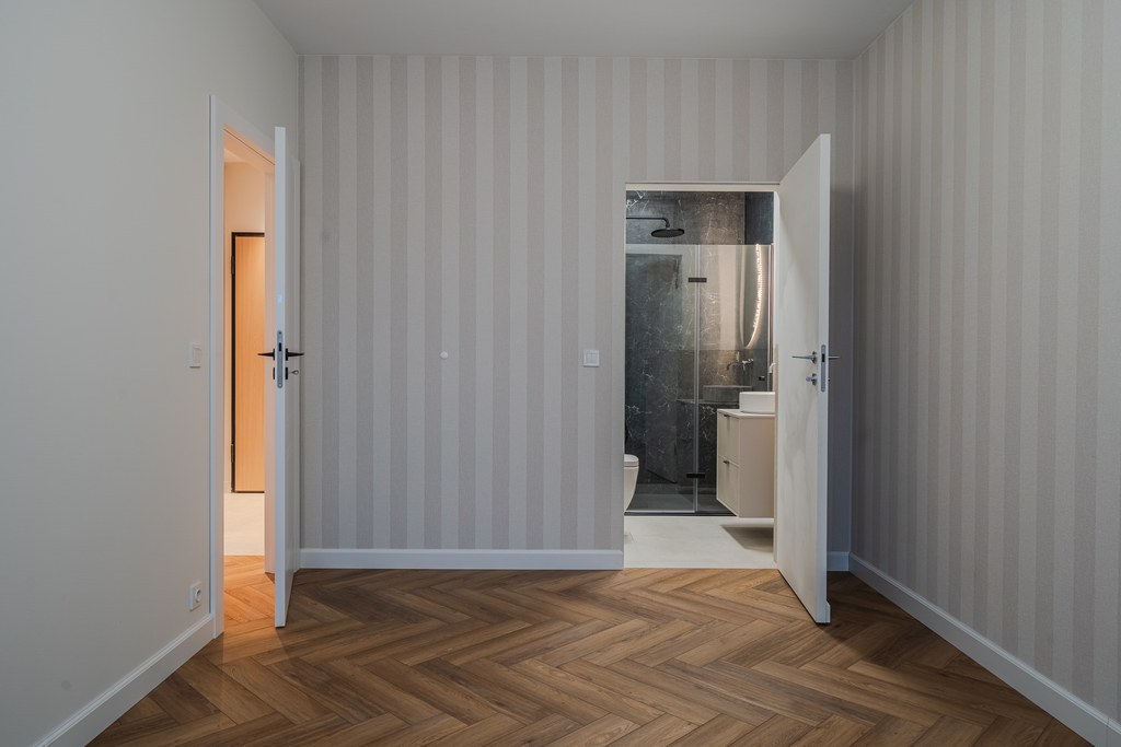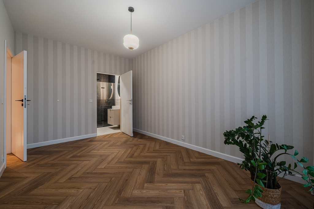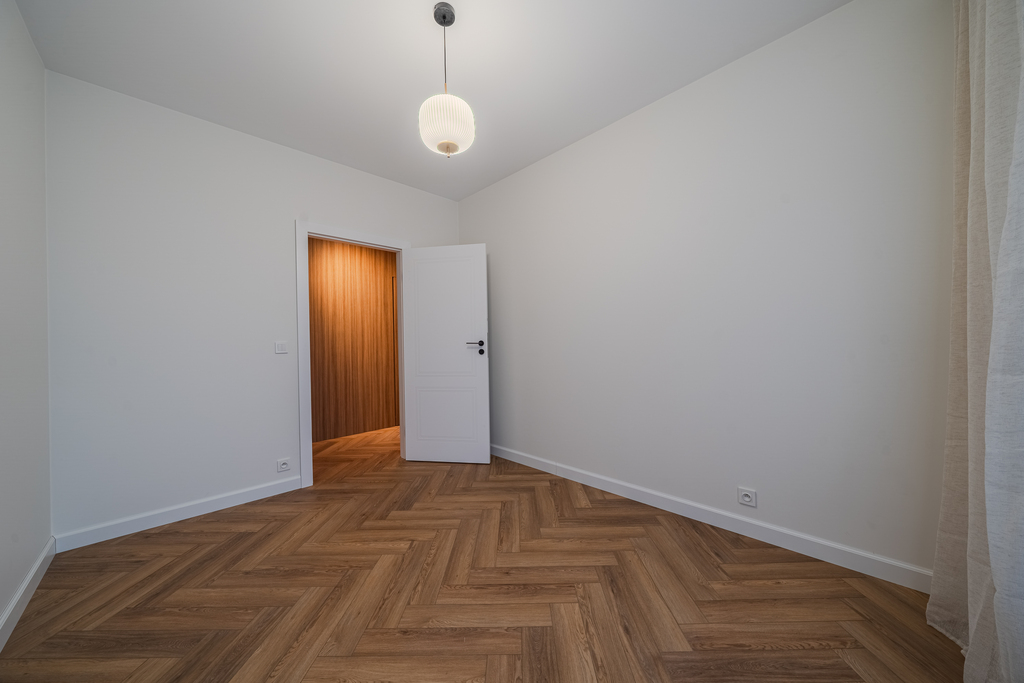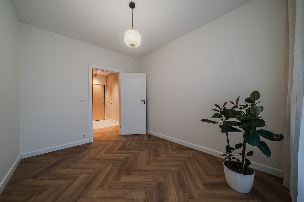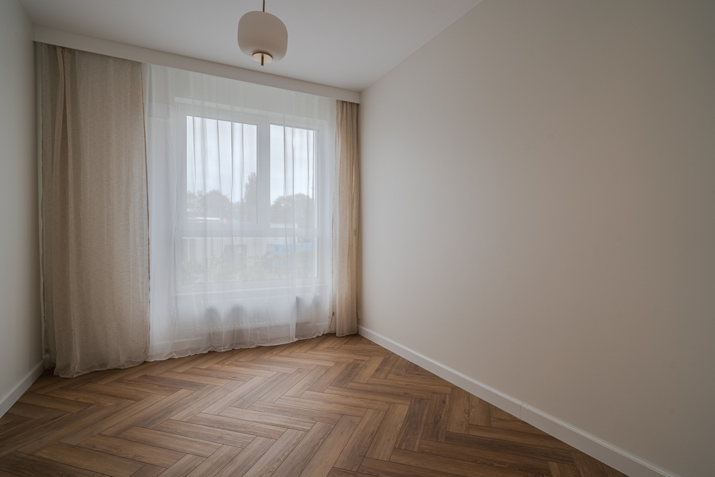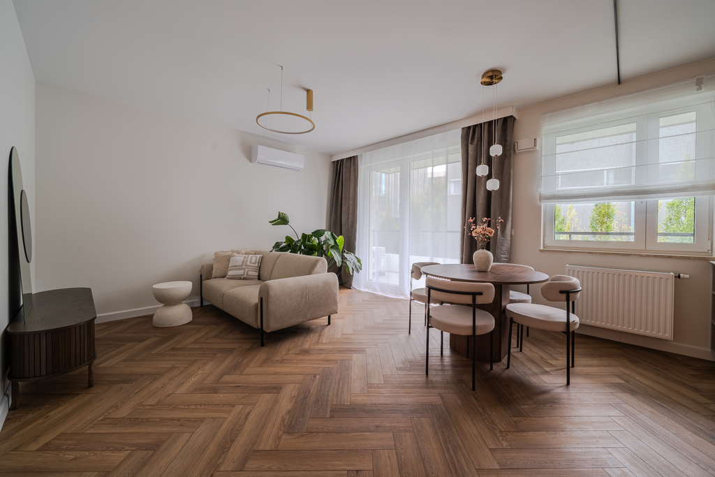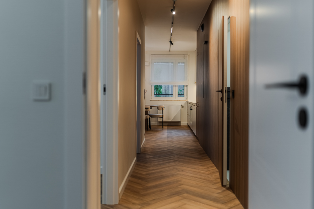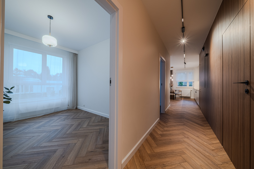 The apartment is located on the first floor of a building with an elevator and consists of a living room with a kitchenette, three separate rooms, one of which is intended as a bedroom, and has its own bathroom. There is a separate wardrobe right at the entrance to the apartment, a bathroom, and a large balcony. An incredible advantage is the fact that no one can look into our windows – we have no neighbors „window to window” on any side.