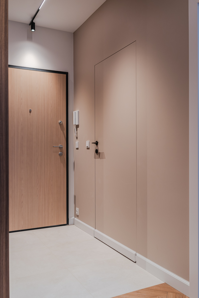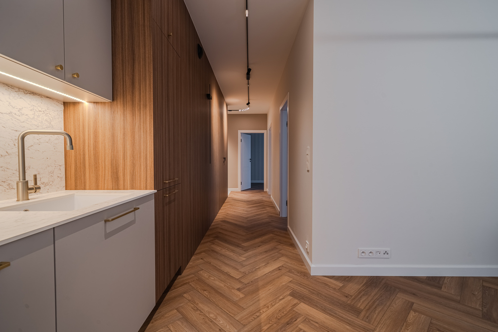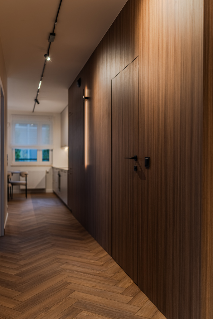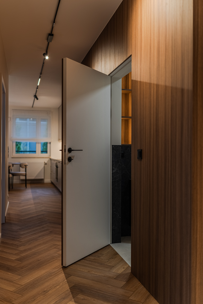 Lighting rail stretching from the hall to the living room/kitchenette – possibility of attaching spot or diffused lighting according to your needs.