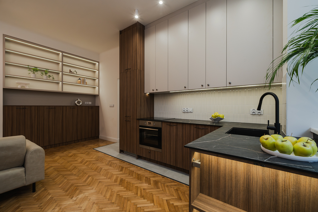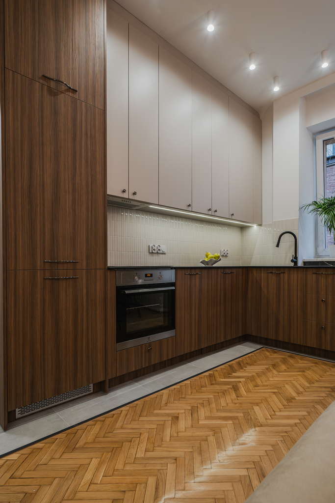 As mentioned above, the property has undergone a complete renovation. The interior has been designed with taste and flair. The furniture is custom-made, and the appliances, such as a washing machine, refrigerator, freezer, and oven, make the apartment easy to move into.