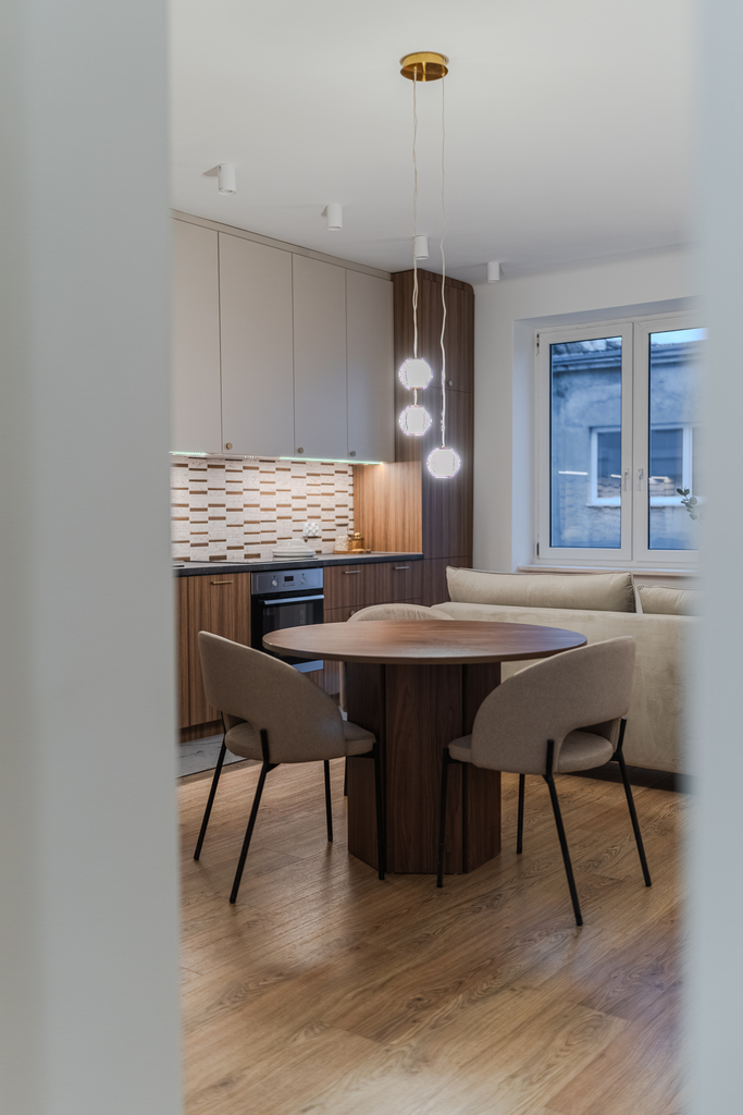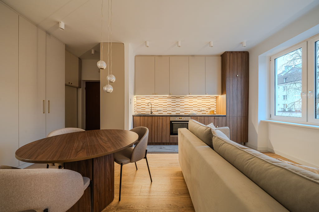 The apartment is located on the 1st floor of a four-story building with a renovated facade. The apartment consists of a living room with a kitchenette and two bedrooms. The apartment faces east and west, with windows on both sides. The apartment includes a basement with an area of approx. 4 m². The apartment has undergone a complete renovation, during which the plumbing and electrical systems were replaced. Form of ownership: full ownership with a land and mortgage register.